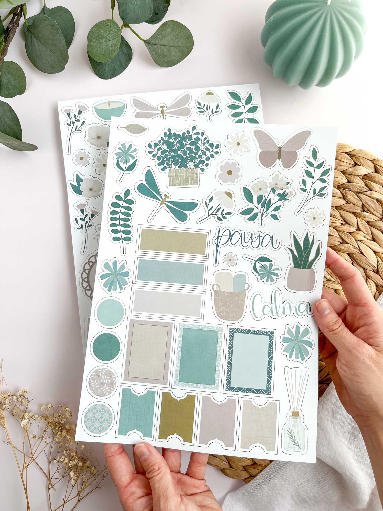 Cada pieza ha sido diseñada con detalle para encajar con la estética serena de la colección. Encontrarás flores, ramas, mariposas, tazas, velas, etiquetas, marcos y elementos decorativos, todos ellos ilustrados con un estilo natural, limpio y lleno de calma.