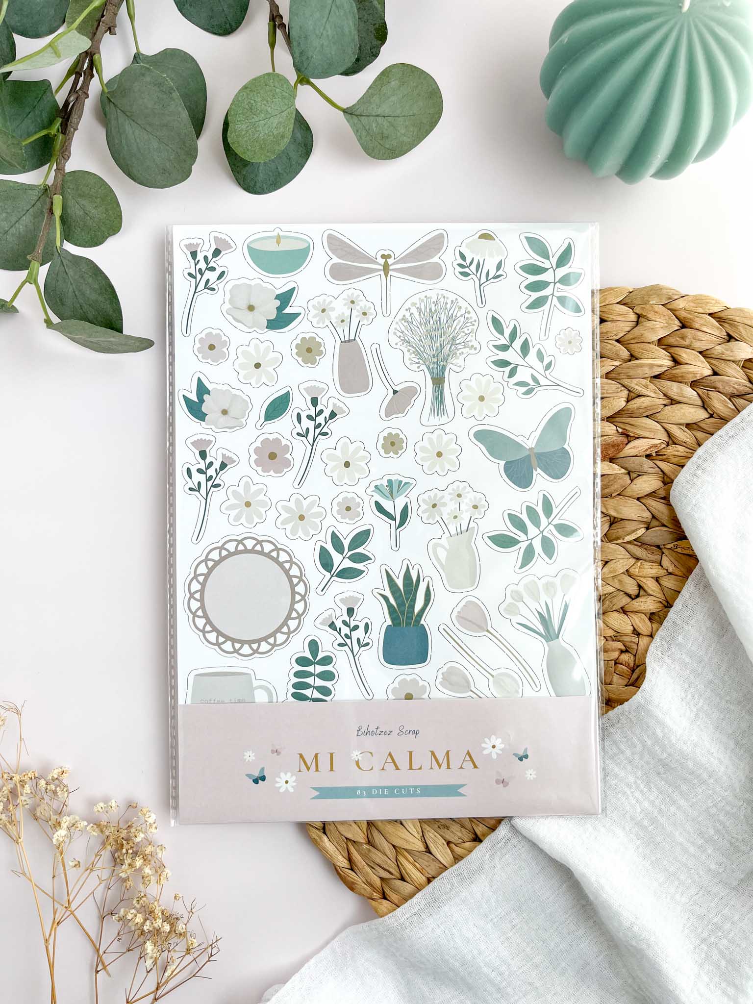 Además, los colores juegan un papel muy especial. La paleta incluye rosas palo, verdes calmados, azul empolvado, beige, blanco roto y ocre suave, que aportan equilibrio y una atmósfera acogedora a cada creación. Esta combinación de tonos hace que los diecuts se integren fácilmente con otros elementos de la colección o con cualquier estilo creativo que ya tengas.