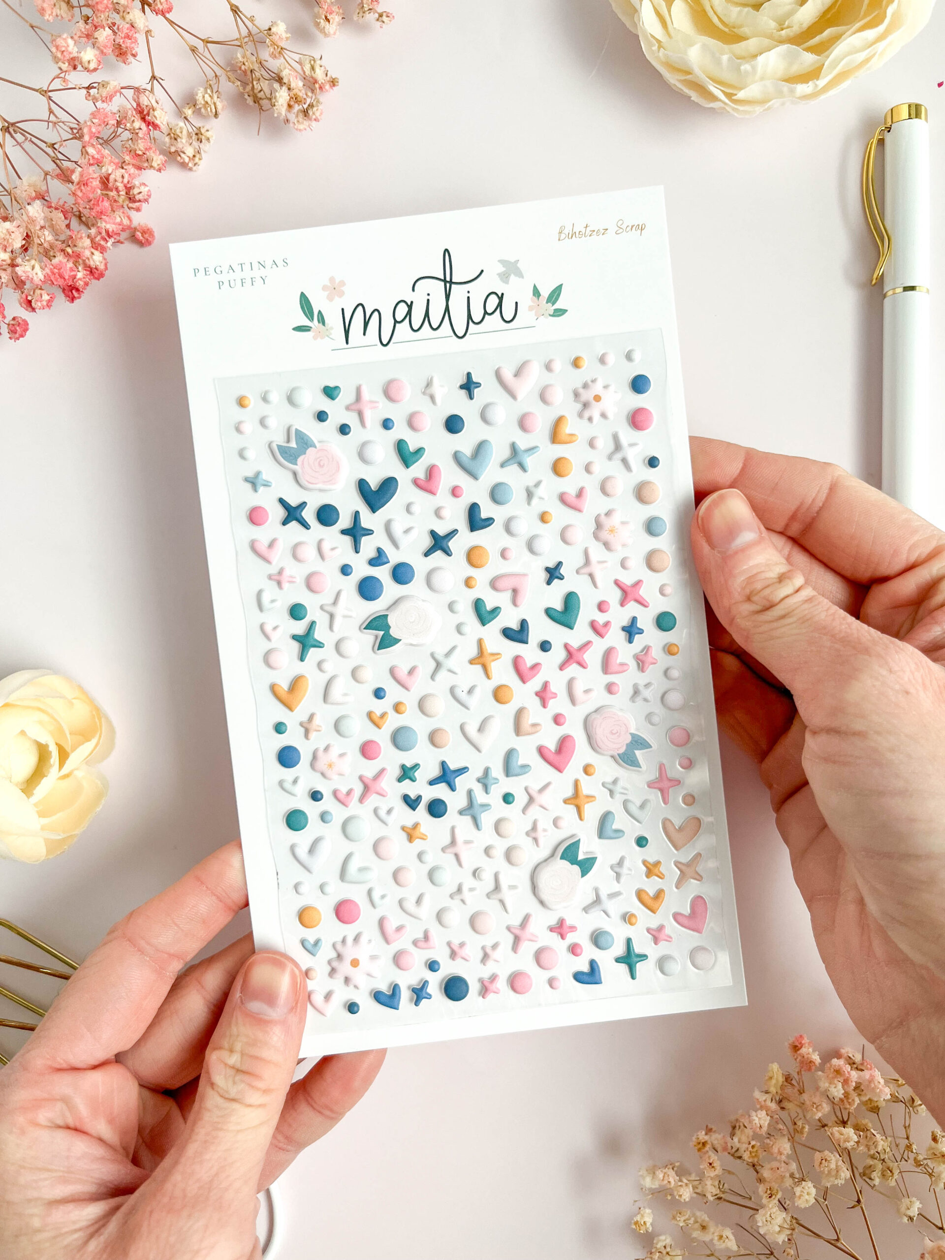 Las pegatinas puffy de la colección Maitia están pensadas para añadir un pequeño toque de volumen y calidez a tus proyectos, sin recargar. Son esos detalles sutiles que acompañan, que arropan la composición y hacen que cada página se sienta un poco más especial.