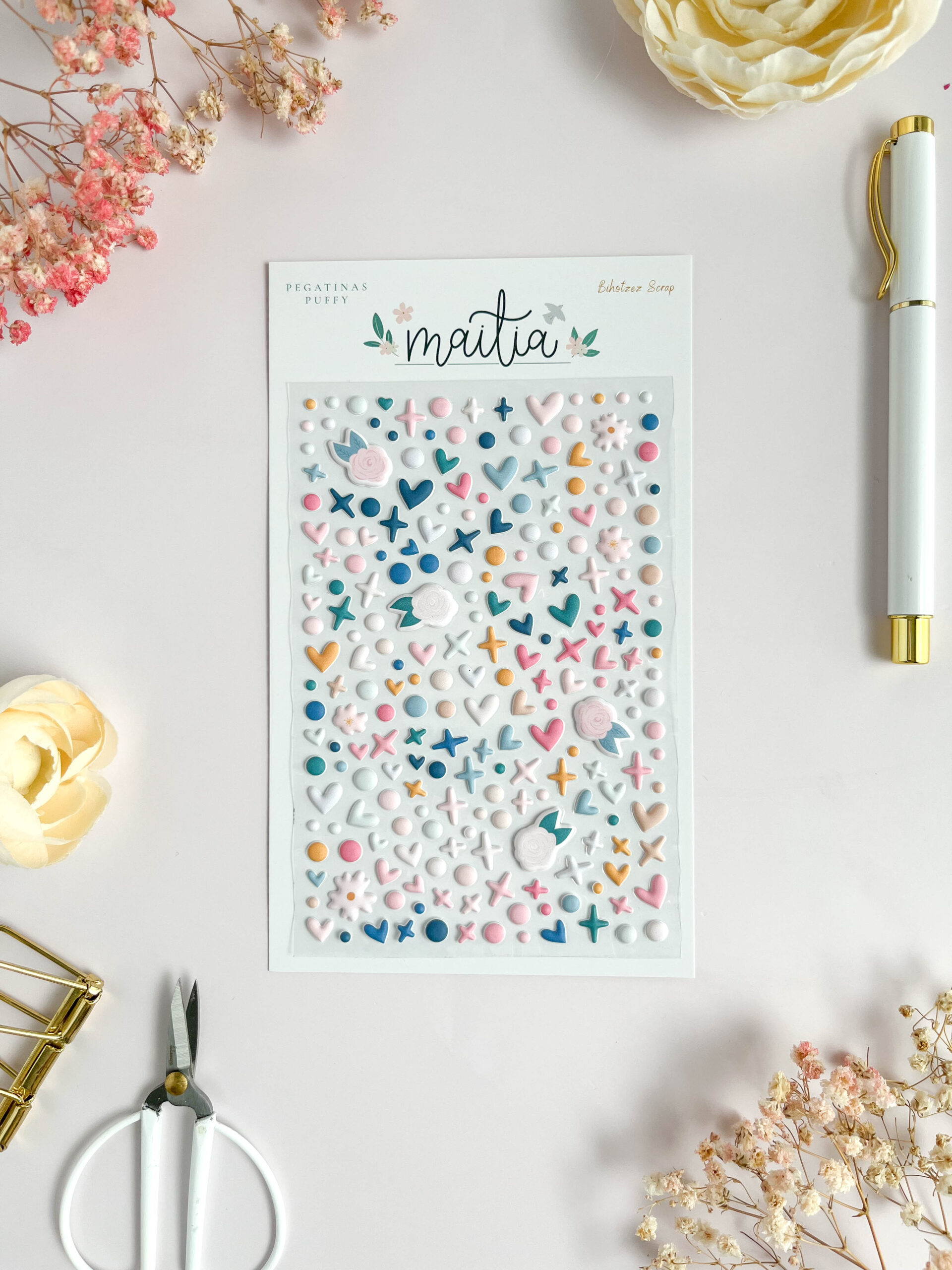 El set incluye pegatinas con volumen suave y agradable al tacto, con diseños sencillos como puntitos, estrellas y corazones, todos ellos creados en armonía con la estética delicada y serena de la colección Maitia. Su relieve aporta dimensión y ayuda a dar profundidad a álbumes, layouts y páginas de journaling emocional.